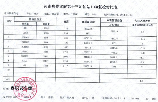 6、初复检数据重复性在正负千分之一之内的初检罐容表准确,初复检数据在正负千分之一以外的初检罐容表测量有误差。